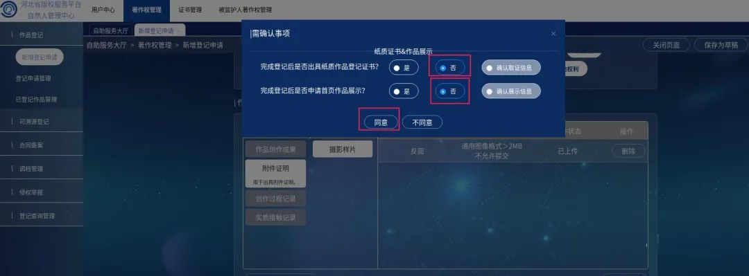 4.在弹窗中确认“是否申请出具纸质作品登记证书”以及“是否申请首页作品展示”;