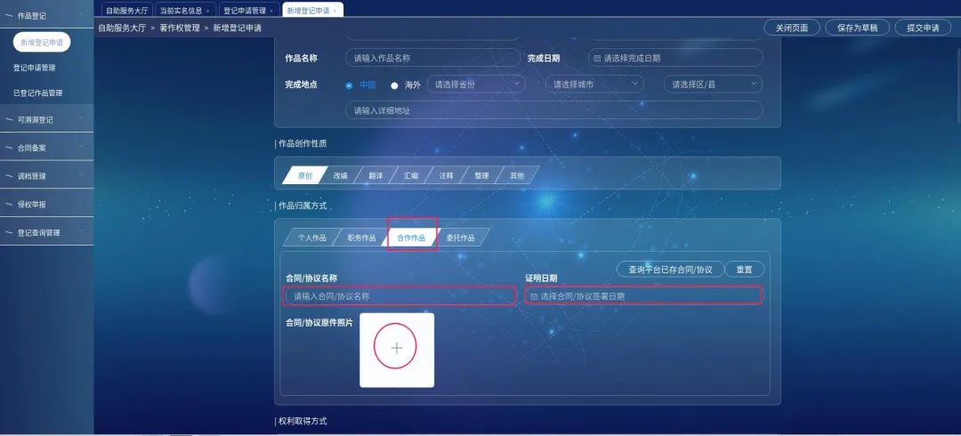 2.合作作品:两人以上合作创作的作品,需上传合作作品合同或协议。