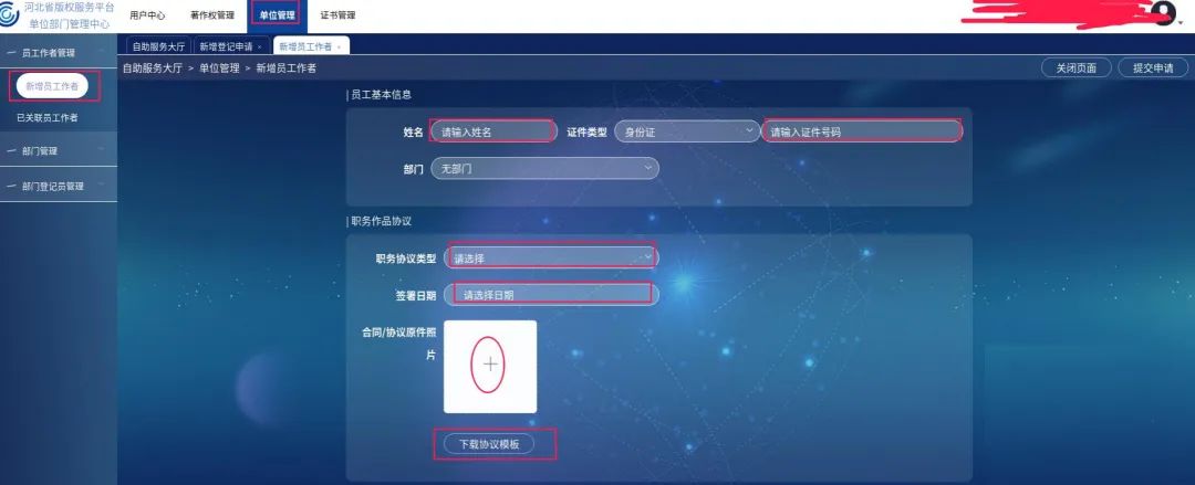 4.职务作品:公民为完成法人或者其他组织工作任务所创作的作品。①公民享有著作权的由公民个人进行登记;②单位享有著作权的由单位进行登记。报社等媒体工作人员创作的职务作品,需上传在职证明;③合同约定著作权由单位享有的职务作品,需上传合同或协议。④委托作品:由合同约定的著作权人进行登记,合同未作明确约定或者没有订立合同的,著作权属于受托人。需上传委托合同。