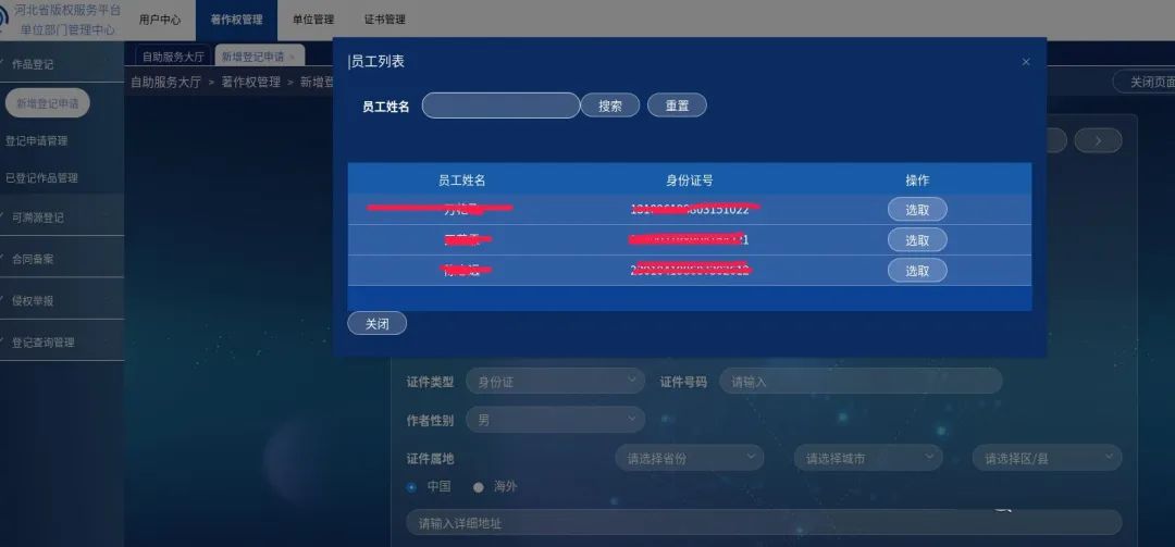 2.点击“著作权管理—作品登记—新增登记申请”,进入作品登记页面;