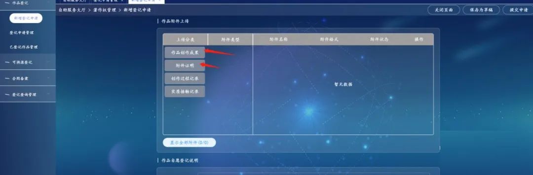 关于美术作品上传问题:美术作品、摄影作品需要在作品创作成果和附件证明中同时上传作品。