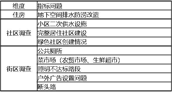 住房维度。围绕住房外立面、楼内楼道、屋顶等层面,针对住宅建筑的使用安全性、围护安全、楼道安全等方面进行调研采集;按照社区介绍的入户对象进行入户访谈,对住宅性能、燃气安全等方面进行调研采集。