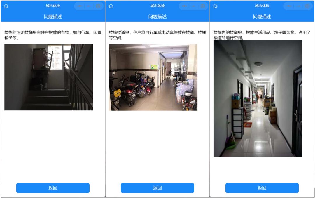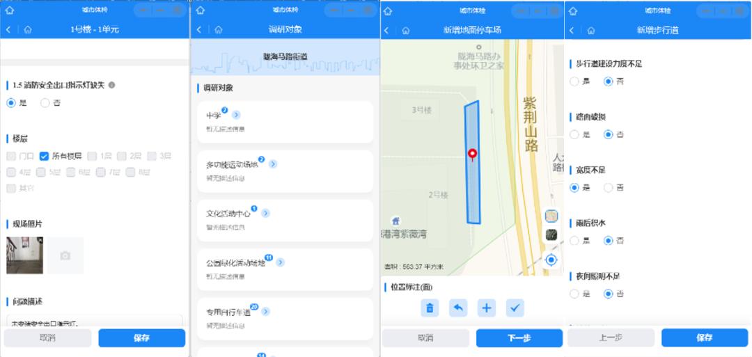 住房实地踏勘。基于采集小程序的问题配置与空间标绘功能,在住房调研时进行实时定位、添加调研楼栋、编辑楼栋基本信息。基于小程序提供的问题设置和问题引导,完成楼栋外立面、楼栋楼道、屋顶及地下四方面的信息采集,包括现场问题位置(楼栋号、单元号、楼层)、现场照片和问题描述等。