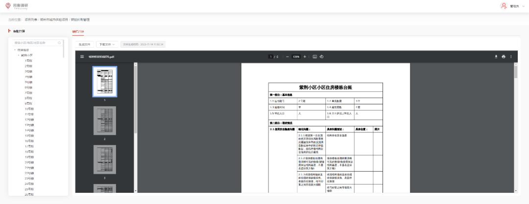 调研报告编制与体检指标计算。针对住房、小区、街区等调研工作数据成果,生成社区调研报告。同时结合现场调研数据,辅助住房、社区(小区)等二十余项指标计算。