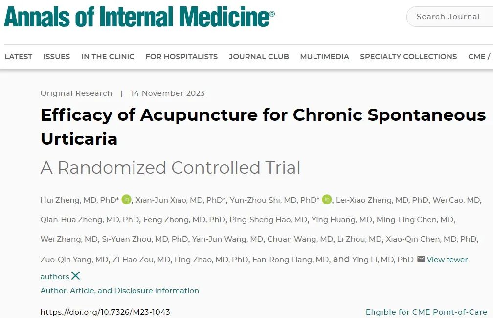 该研究成果以“Efficacy of acupuncture for chronic spontaneous urticaria: a randomized controlled trial”(针灸治疗慢性自发性荨麻疹的有效性:一项随机对照试验)为题,于2023年11月14日发表在《Annals of Internal Medicine》(内科年鉴)期刊。据悉,《Annals of Internal Medicine》(内科年鉴)是创刊于1922年的临床医学顶级刊物,一直是重大临床研究成果的聚集地,号称国际内科学领域“第一刊”。
