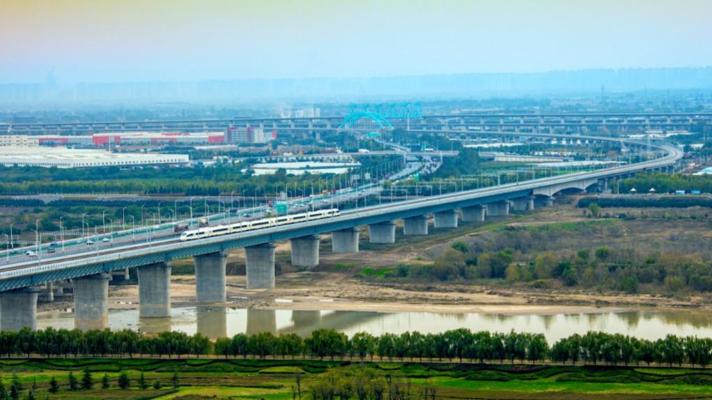 银西高铁是我国首条在黄土地区建成的有砟长大干线高速铁路,咸阳渭河特大桥是全线控制性工程,桥梁全长13.578公里,大桥具有“一桥十跨”的特点:两次跨越高速公路,两次跨越河道,两次跨越铁路既有线,四次跨越城市道路,体量庞大、结构复杂、技术标准要求高。