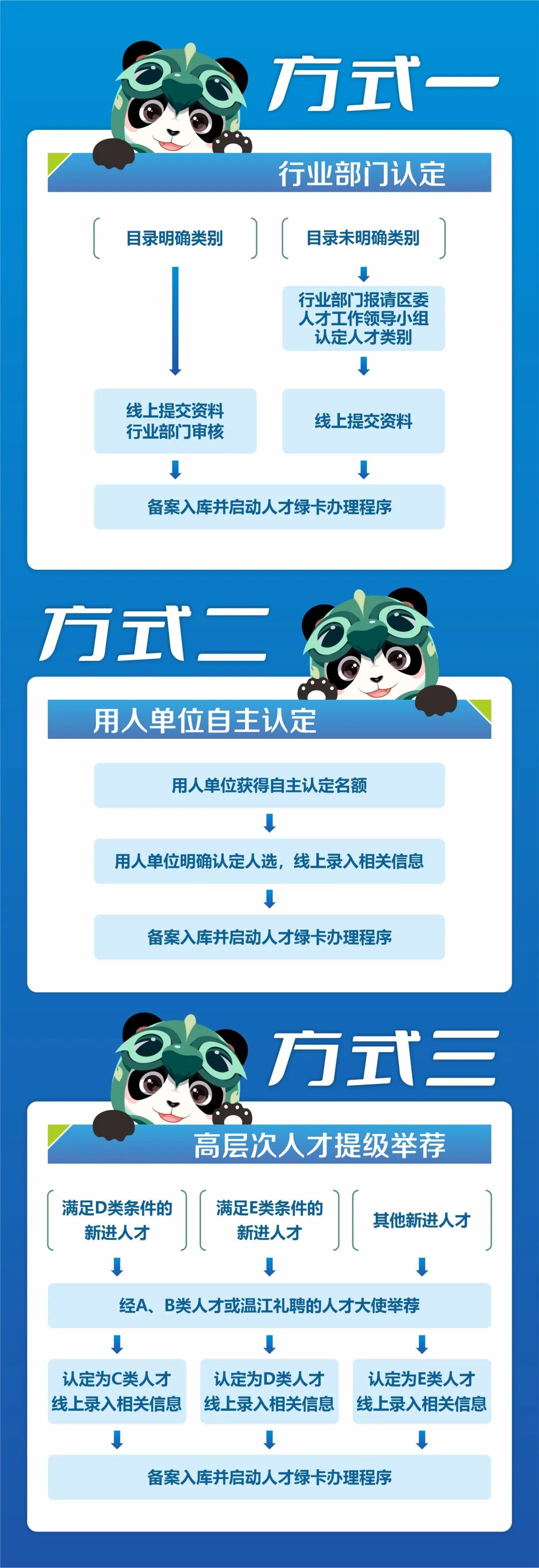 以上用人单位的人才可选择行业部门认定、用人单位自主认定、高层次人才举荐认定,三种方式的任意一种进行人才认定,详情见下图: