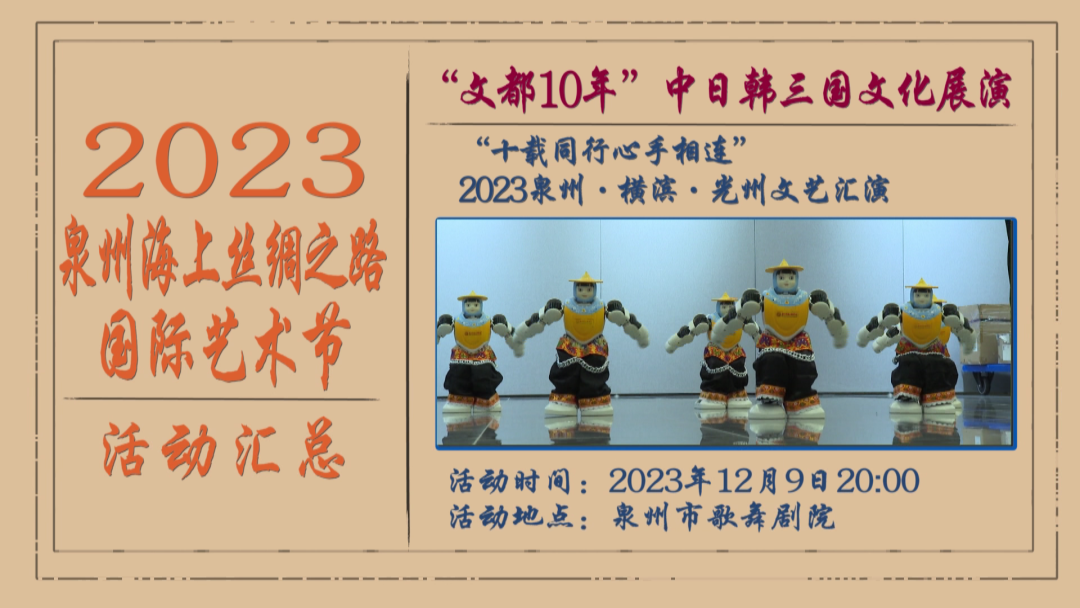 今年是泉州与日本横滨、韩国光州共同当选“东亚文化之都”10周年。为庆祝十载同行,作为第五届海上丝绸之路国际艺术节五大主题板块12项活动之一,三个城市的舞蹈团队将以“十载同行 心手相连”为主题,在泉州共同上演一场精彩的文化展演。