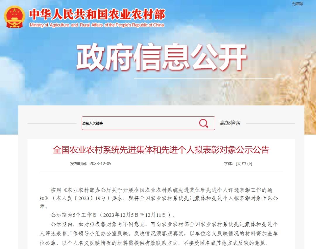 12月5日,农业农村部发布《全国农业农村系统先进集体和先进个人拟表彰对象公示公告》。黑龙江省7个集体、21名个人拟入选。