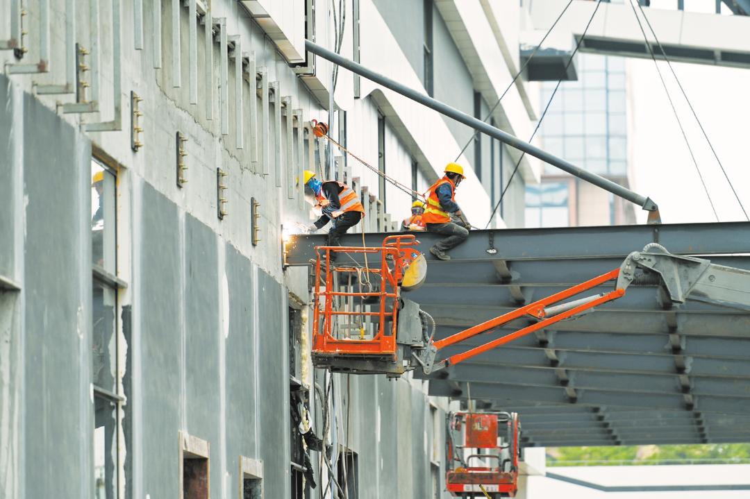 近日,在海口综保区高端食(药)材加工标准厂房项目现场,工人正在进行钢结构雨棚施工。记者 石中华 摄
