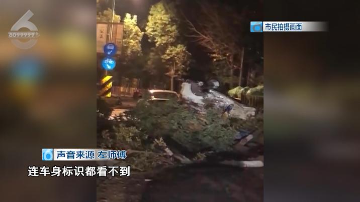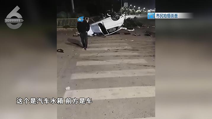 目击者左师傅称,当晚,轿车撞断了几棵行道树后,四脚朝天翻在斑马线上,引擎盖已经面目全非,车窗玻璃都碎了,车子就剩个光架子,连标识都看不到,车辆配件飞的到处都是,发动机飞出去了20多米。