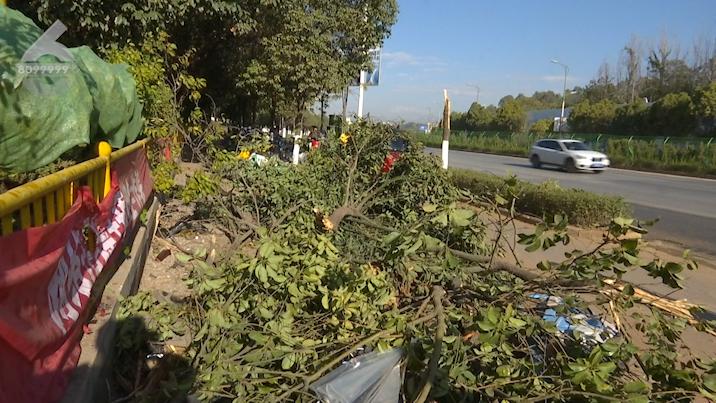视频画面中可以看到,在东三环呼马山车市大门附近一片狼藉,断裂的行道树倒伏在非机动车道上。