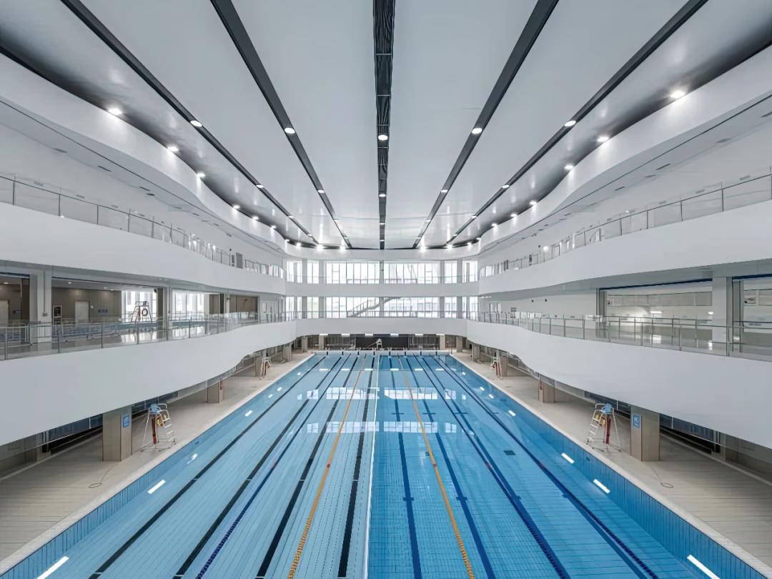 上海游泳馆始建于1983年,是当年著名的优秀建筑,曾举办过多项世界级重要赛事。改造前主要以大众泳池、青少年游泳训练、跳水队训练三项功能为主,少量赛事功能为辅,改造后转型为向公众开放的“市民水上运动中心”。通过内部空间升级改造,取消赛事功能,保留原跳水池部分的训练功能,整合现状标准游泳池、儿童游泳池等。内部拆除泳池两侧看台,增加休闲戏水池等设施和配套服务空间。改造设计的灵感来源于海洋的奥秘与自然之美。建筑的外立面波浪状的雨棚,与点釉玻璃上的气泡图案,均强调了这一概念。室内设计则通过楼层的划分,呈现出浅海区、深海区和海底世界的不同特征。