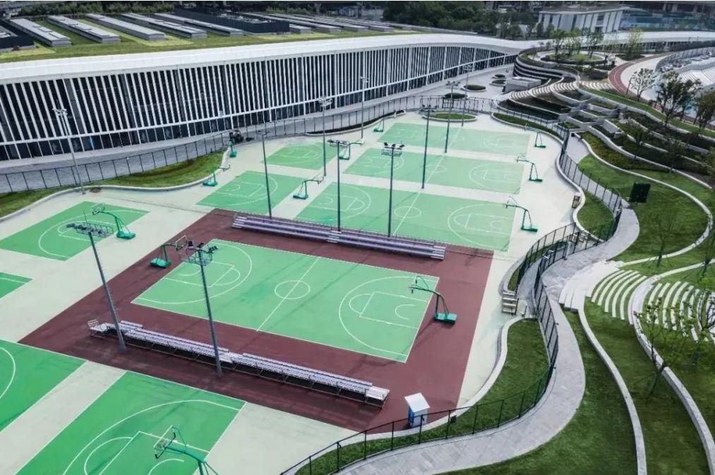 周围被错落有致、蜿蜒绵亘的草阶环绕,最大化的引入自然采光和通风,同时也是市民休憩和观看篮球比赛的适宜场地。