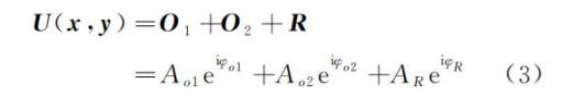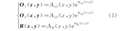 设 xy 平面为感光板平面,O1表示物光1的一个点光源,O2 表示物光2的一个点光源,R 表示参考光的点光源,它们在感光板平面上任一点(x,y)的复振幅分别为