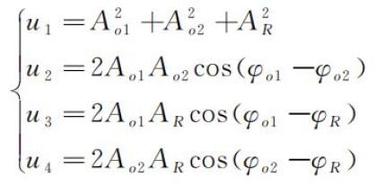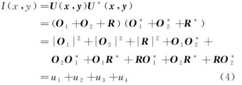 式(4)反映了干涉场叠加后的光强分布,其中含有关于振幅和相位的信息。等式右边第一项u1为两束物光和参考光的光强,对感光板平面上任一点为常数,提供了均匀分布的背景光强。后面三项均为干涉项,分别反映了两相干光的振幅和相对位相的关系,可以看出,第二项u2记录了两束物光相干叠加的信息;第三项u3对应的是物光1和参考光相干叠加的信息;第四项u4对应的是物光2与参考光相干叠加的信息。可见在底片上,干涉图样将物光波的振幅和相位两种信息全部记录下来。