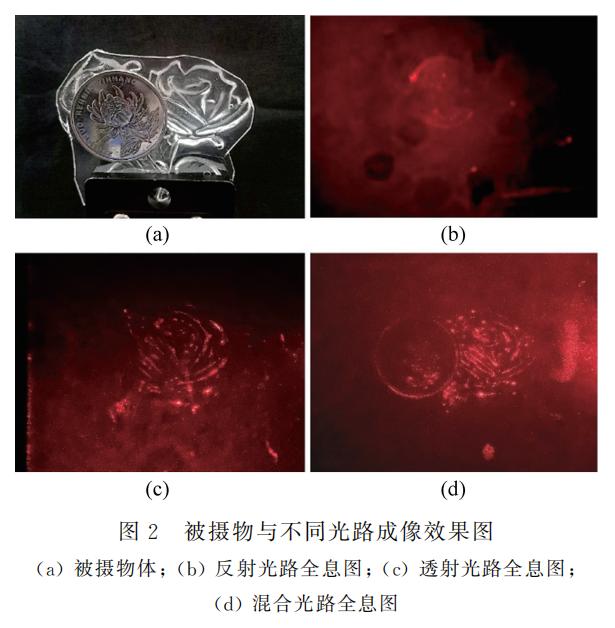 图(b)反映对照实验一,在只有反射物光作用的光路中,被摄物只有不可透光的硬币可以看到清晰物像。对可透光的浮雕花朵,大部分照明光透射过去,只有极少部分光经过反射到达干板,成像效果差。图(c)反映对照实验二,在只有透射物光作用的光路中,被摄物只有可透光的浮雕花朵可以看到物像,而不可透光的硬币看不到物像,丢失了硬币的信息。