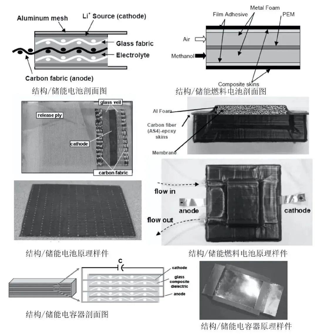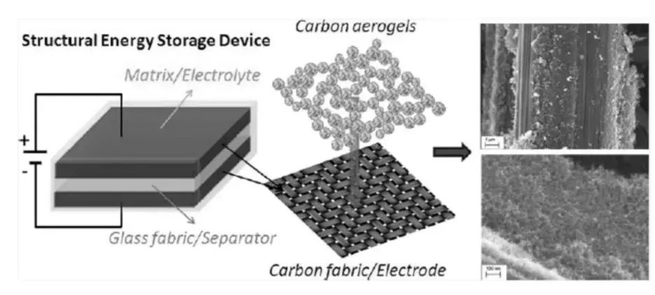 碳纤维材料所具有的良好力学性能和电化学性能使结构/储能一体化碳纤维复合材料成为可能。2000年起,美国陆军研究实验室、瑞典皇家理工学院和吕勒奥理工大学、英国帝国理工大学等机构陆续发表了多种结构/储能一体化碳纤维复合材料的结构及相关性能研究报告。