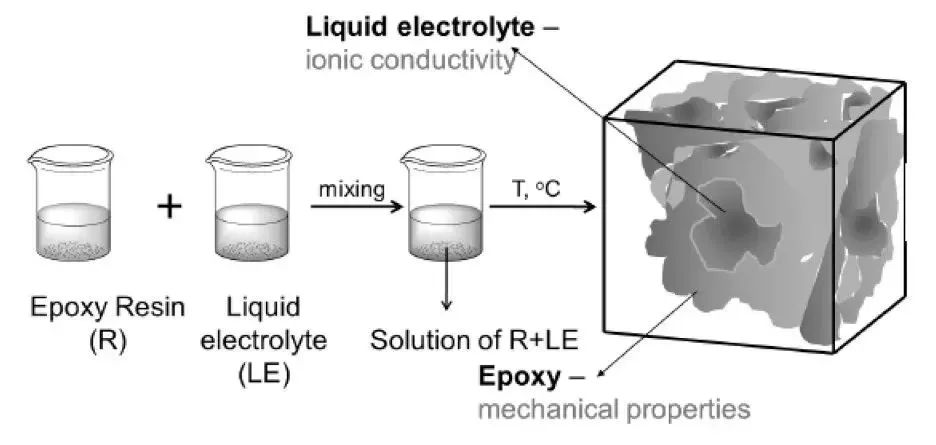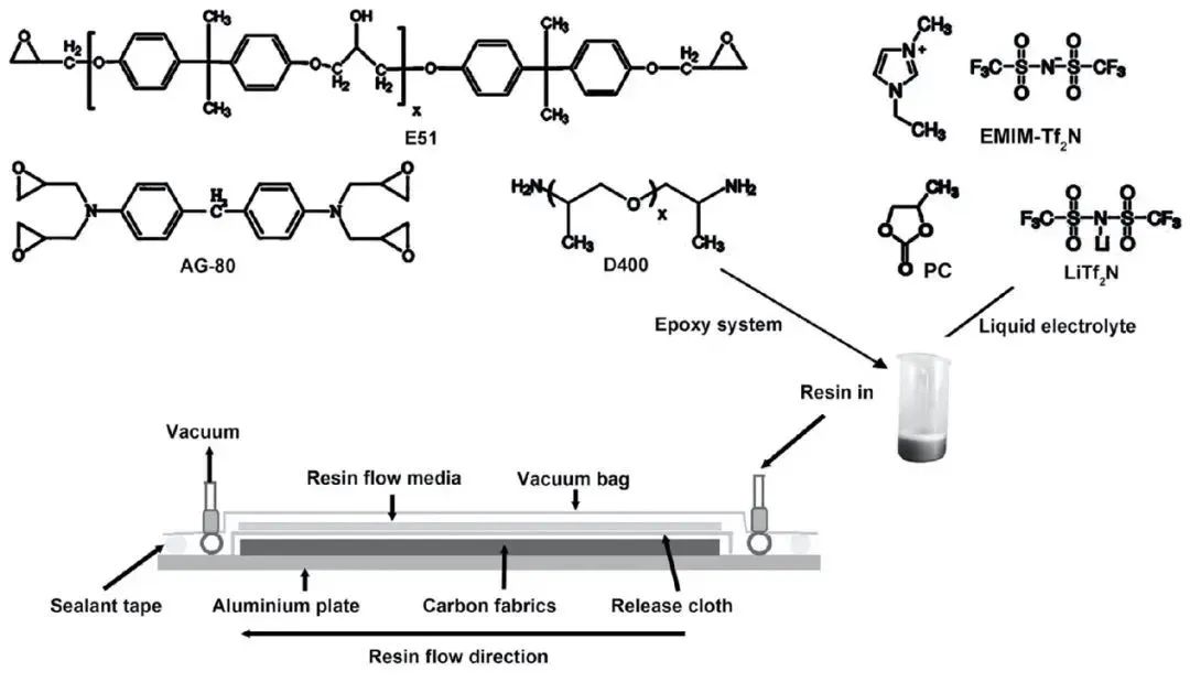 ICL在用于结构/储能一体化复合材料的高分子电解质改性方面也有研究。研制了一种基于双连续相离子液体-环氧树脂体系的新型结构电解质。这种结构电解质室温下离子导电率达0.8 m S/cm,杨氏模量0.2GPa,合成路线见图5。