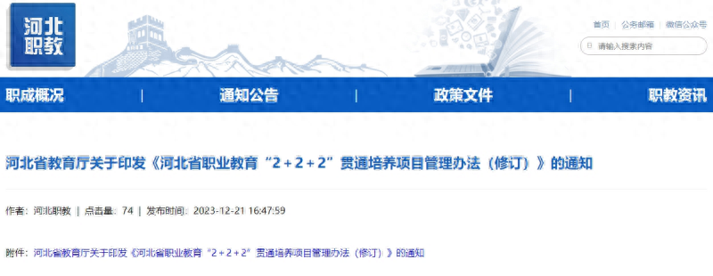 近日,河北省教育厅印发关于《河北省职业教育“2+2+2”贯通培养项目管理办法(修订)》的通知,详情如下↓