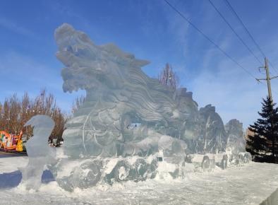 “双龙送福”冰雕——单体长4.5M,宽2M,高2M。