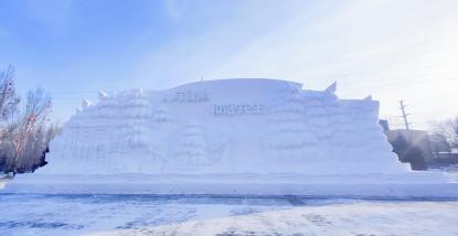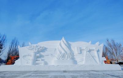 雪雕正面以旗帜为背景,寓意大庆油田牢记当好标杆旗帜、建设百年油田的嘱托。