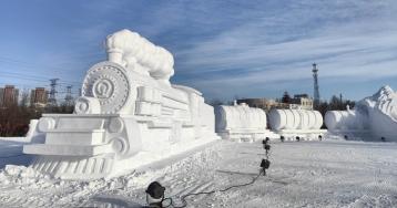 时光列车雪雕——全长165M,宽4M,高5M ,以火车发展阶段为时间引线,蒸汽机车时期、内燃机车时期、电力机车时期、高速列车时期,把童年最美好的回忆用彩冰雕刻的手法一幕幕呈现在游客眼前。