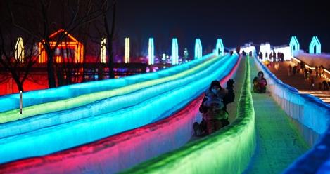 两组6道冰滑梯,单条滑道达80米,一组4滑道冰滑梯,单条滑道达110米,在每条滑道扶手上以亮化灯为点缀,闪亮夺目,如梦如幻,点燃游客心中的冰雪激情,尽享趣味十足的“冰嬉之旅”。
