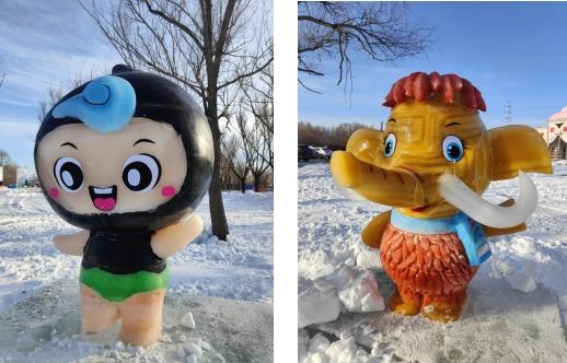 位于入口两侧“萌萌”和“油油”吉祥物冰雕就是彩冰工艺制作而成,以旅发大会吉祥物卡通形象欢迎游客的到来。