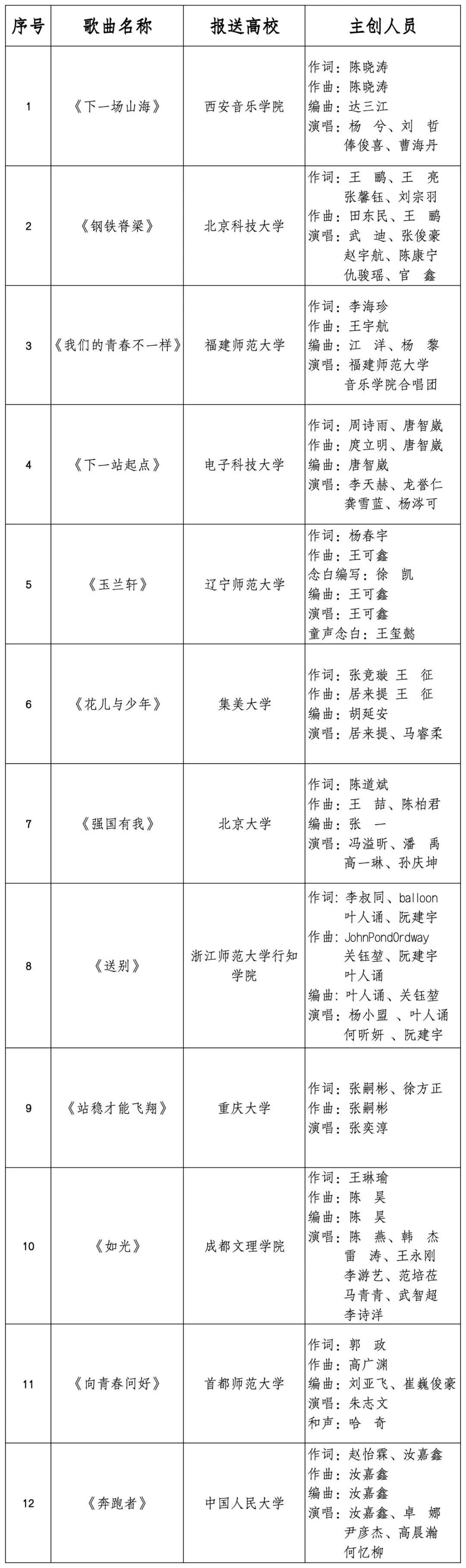 由中宣部文艺局和教育部思政司指导、中国教育电视台主办的“牢记时代使命 唱响青春旋律”全国校园歌曲创作推广活动,经过征集、创作、评选,2023年有12部作品入围年度优秀原创校园歌曲。