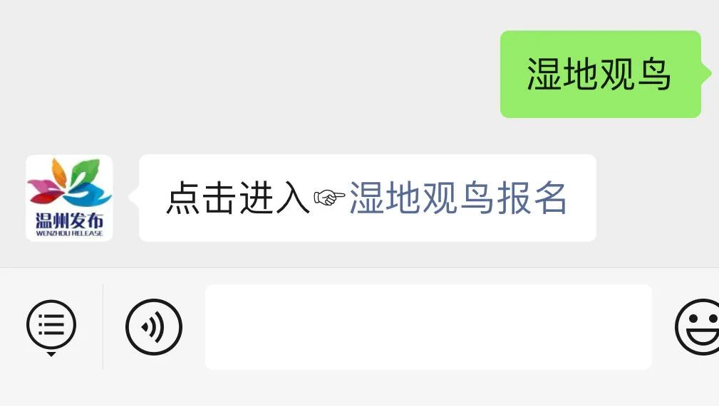 有意向者请关注温州发布后回复“湿地观鸟”获取报名链接(操作如下),准确填写姓名及联系方式,根据报名顺序额满为止。报名截止到12月31日下午5点,入选后将有工作人员主动联系,请关注电话信息。
