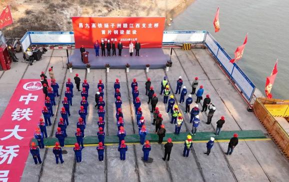昌九高铁扬子洲赣江公铁大桥横跨赣江,是新建京港高速铁路九江至南昌段的关键控制性工程。大桥西支主桥长706米,主跨320米,下层中间通行双线高速铁路,设计时速350公里,两侧通行4车道城市主干道,设计时速60公里,上层通行双向8车道城市快速路,设计时速80公里。