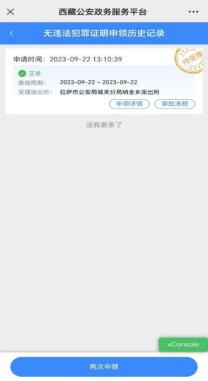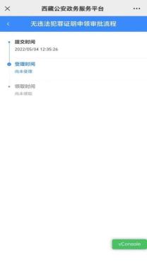 提交申请后,可在申请页面看到办理进展,办理单位会根据提交的材料进行信息确认,如材料存在问题,则会返回不予受理理由,如未发现申请人有犯罪记录则会返回《无犯罪证明》PDF格式文件,如发现申请人有犯罪记录则返回《不予出具无犯罪记录证明通知书》PDF格式文件。