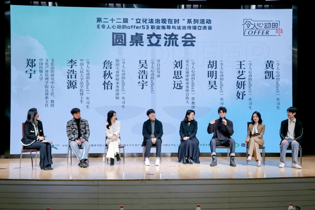 近期,中国传媒大学举办第二十二届“文化法治现在时”开幕式暨《令人心动的offer5》职业指导与法治传播交流会,邀请《令人心动的offer5》带教律师、竞天公诚律师事务所合伙人刘思远,《令人心动的offer1》实习生、中国人民大学法学院博士生李浩源,《令人心动的offer2》实习生、海润天睿律师事务所律师詹秋怡,《令人心动的offer5》实习生胡明昊、黄凯和王艺妍妤,围绕着参加节目的收获、个人选择和成长的心路历程、如何提升职场竞争力、对在校生的求职建议等话题进行交流分享。
