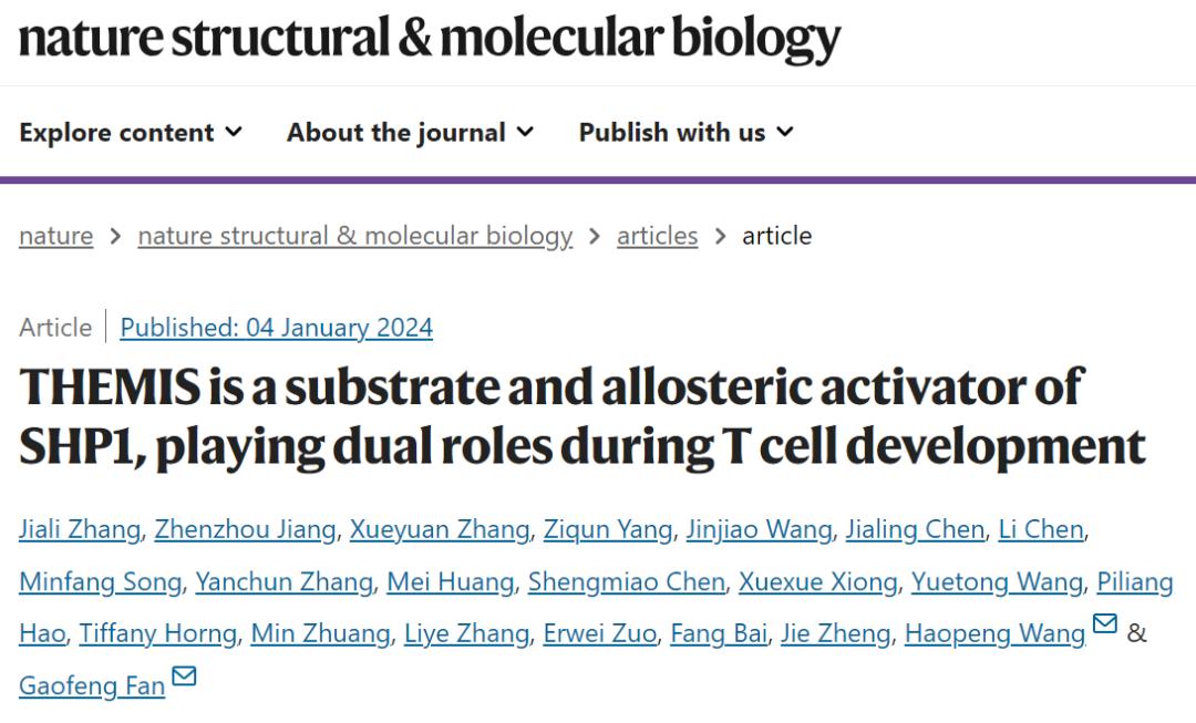 1月4日,上海科技大学生命学院范高峰/王皞鹏课题组在Nature Structural & Molecular Biology上发表了题为 THEMIS is a substrate and allosteric activator of SHP1, playing dual roles during T cell development 的研究论文,揭示了T细胞发育调控基因THEMIS的具体作用机制,解决了领域长期以来的争论。