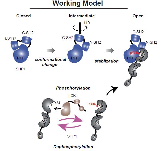 为了揭示THEMIS磷酸化的生物学意义,作者构建了THEMIS Y34F敲入和THEMIS敲除小鼠,利用流式细胞术分析了小鼠T细胞发育和增殖情况,发现了THEMIS Y34F敲入小鼠胸腺T细胞从双阳性阶段发育到单阳性阶段有明显的阻滞,并且脾脏中的CD4单阳性T细胞明显减少,这与THEMIS敲除小鼠的表型类似。通过测定体外纯化的SHP1蛋白和从小鼠胸腺细胞中免疫沉淀的SHP1蛋白的酶活,作者发现磷酸化的THEMIS可以激活SHP1,这说明THEMIS可能是SHP1的一个变构底物。进一步作者利用氢氘交换质谱、表面等离子共振等技术,发现磷酸化的THEMIS肽段结合SHP1的PTP结构域K520位点从而稳定SHP1的激活构象。因而提出了新的THEMIS作用模型:在TCR刺激后,LCK磷酸化THEMIS的Y34位点,磷酸化的THEMIS将SHP1稳定在开放的构象,激活的SHP1会抑制TCR信号的传递,从而保证正常的阴性选择。