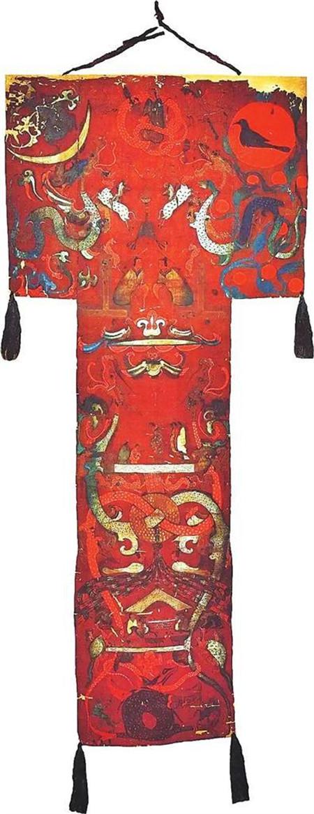 T形帛画是丧葬仪式的重要组成部分,绘有死者画像,出殡时用竹竿悬挂,起引导作用,入葬时覆盖在内棺上。其作用与《仪礼·既夕礼》记载的“铭旌”有相似之处,是引导墓主灵魂升天的媒介。据墓中遣册记载,T形帛画名为“非衣”,“非”与“飞”相通,“非衣”即“飞衣”,意为祝愿墓主灵魂穿上非衣飞升,使墓主重生。