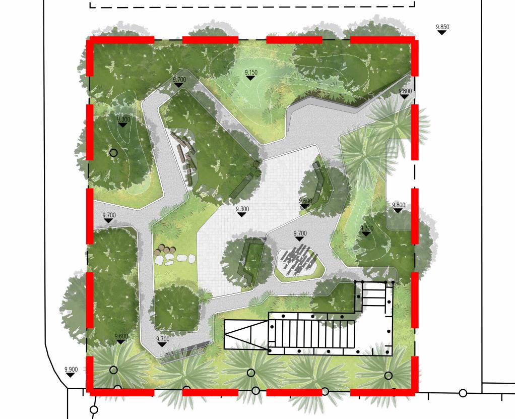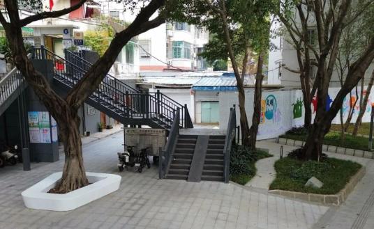 结合现状已有绿化、人行道、广场及交界面台阶等条件的前提下,保留现状大树、重新梳理绿植关系、更新铺装材质、适当补充园林小品设施和小布景。