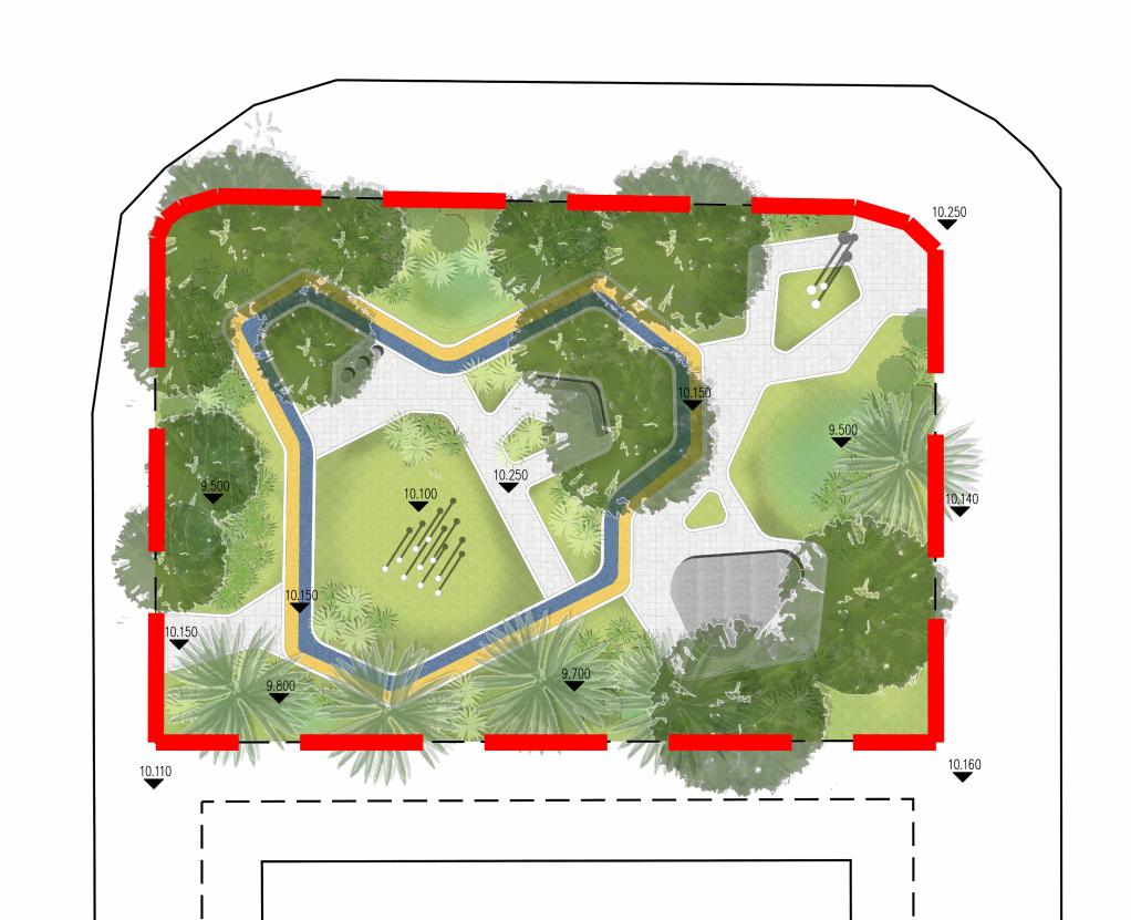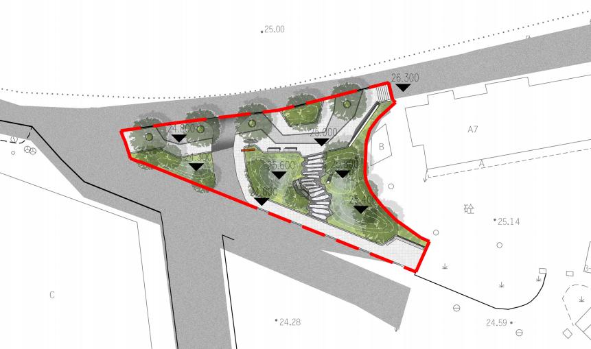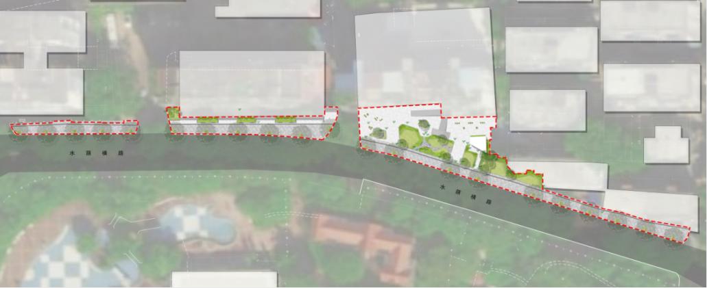 在有限的空间内为行人和附近单位的人员打造一个精致、舒朗、尺度宜人的街边带状口袋公园空间。