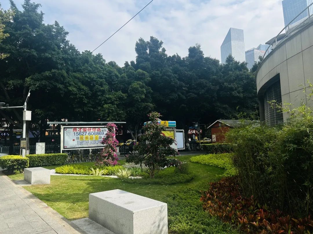 体育西路地铁站G出口绿化带采用草地 + 乔灌木、地被结合的方式;围绕出风口周边进行绿化遮挡,前景点缀特色开花乔木及多年生组合花境进行搭配。