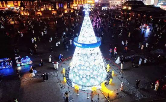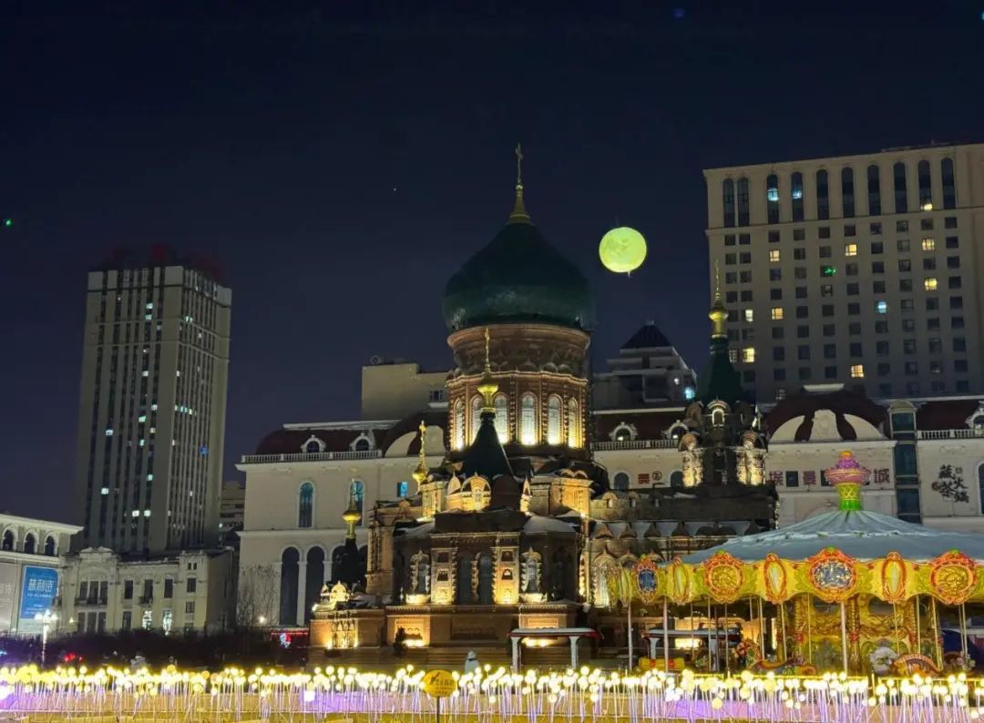 它是浪漫的哈尔滨!一轮“绝美月亮”在索菲亚广场上空升起,这个直径5米的“绝美月亮”是索菲亚广场今冬重点打造的“月色星光 梦幻北境”系列场景之一,在春节、元宵节等重要节点都会升起;一棵高13米、直径8米的“幸运月桂树”屹立在索菲亚广场北侧,月桂树两侧是繁星璀璨的星光花海,与不远处的索菲亚教堂遥相辉映。月影萦绕,桂树飘香,索菲亚广场上,让浪漫梦幻照进现实。