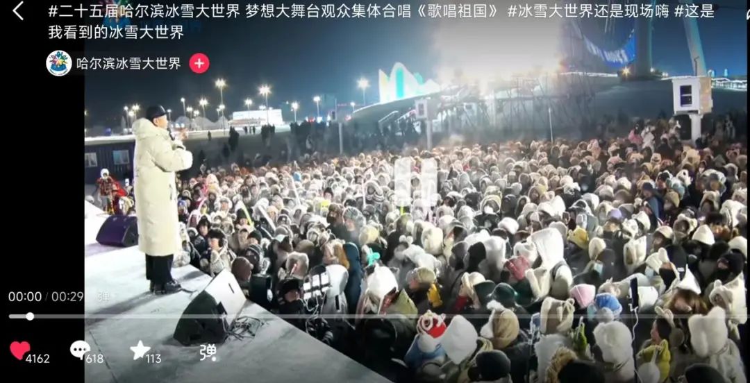 第二十五届哈尔滨冰雪大世界主办方邀请达人“探店”,在抖音平台提前向用户们掀开“神秘面纱”,通过抖音直播万人蹦迪的火爆场景,赚足了眼球。
