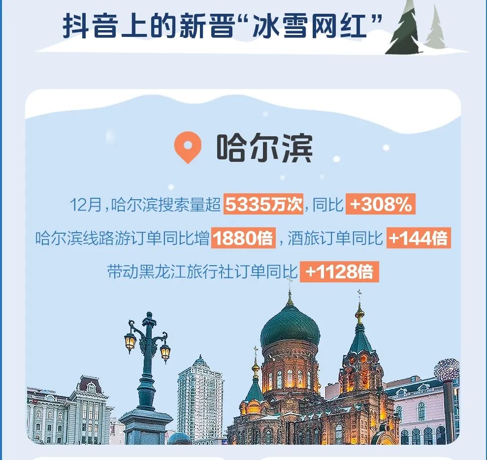在抖音生活服务发起的“冬季旅行超有范”冰雪温泉旅游季营销活动中,近1万个冰雪商家,提供了7万多种冰雪商品。其中,预售券、团购券和住宿最受用户欢迎。刚过去的12月,哈尔滨抖音酒旅订单同比增长144倍。哈尔滨的线路游订单同比增1880倍。热度带动黑龙江旅行社订单环比增240%,同比增1128倍。