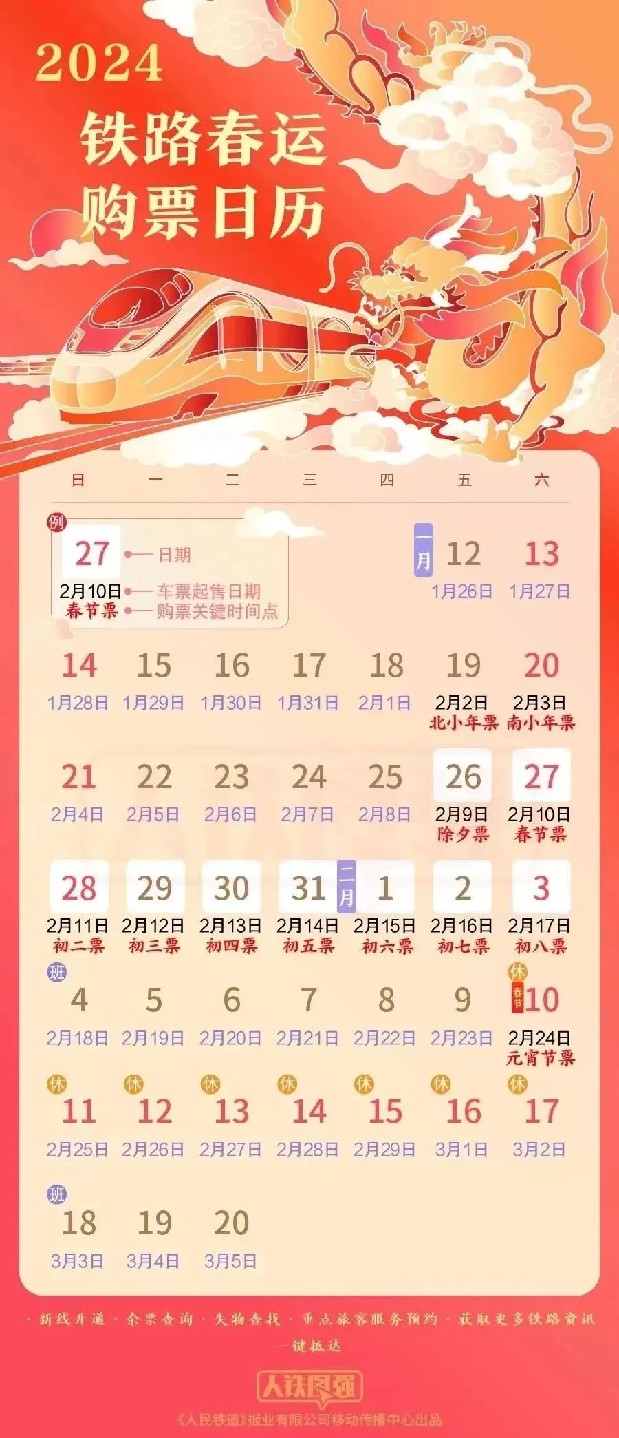 据中国铁路局消息,2024年春运自1月26日开始至3月5日结束,共40天。期间,铁路部门将统筹春运客流组织,不断提升铁路运输服务品质。根据目前铁路客票预售规则(预售15天内火车票),2024年1月12日,2024年春运首日火车票已正式发售。本周可购买2月5日-2月11日车票,其中1月26日可购买除夕车票,1月27日可购买春节车票。本周三、周四,春节火车票就将进入售票高峰期。