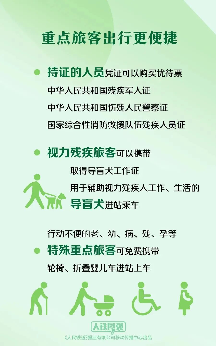 视力残疾旅客可以携带取得导盲犬工作证,用于辅助视力残疾人工作、生活的导盲犬进站乘车。行动不便的老、幼、病、残、孕等特殊重点旅客可免费携带轮椅、折叠婴儿车进站上车,出行更加便捷。
