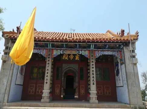 “小金顶”东西长,南北窄,地势平坦。最西端为极顶,建有圆顶建筑,圆顶之下,又展伸八角,以示八卦之意,故称“八卦殿”;山顶正中建主体建筑玄帝殿,该殿全为青石砖甏砌,门窗亦为青石雕刻,不带一点杂木,故又称“无梁殿”,现与“五龙宫遗址”一起均为市级文物保护单位。在玄帝殿前,又有拜殿三楹,与八卦殿、玄帝殿并称“金鼎三殿”。殿内面积不大,却布局严谨,静寂肃穆。