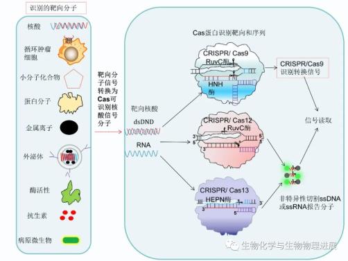 也许一提到CRISPR/Cas技术,人们的第一反应是,CRISPR/Cas技术是一个高效的基因编辑系统。其实,CRISPR/Cas系统是一个多面手,不仅具有高效基因操作功能,还具有分子检测能力。本文带您了解一下CRISPR/Cas高效的分子检测能力,CRISPR/Cas系统不但可以检测核酸分子(DNA/RNA),还可以检测非核酸分子(小分子化合物、重金属、蛋白质、肿瘤循环细胞、外泌体等)[3](图1)。参与分子检测常见的CRISPR/Cas系统有CRISPR/Cas9、CRISPR/Cas12、CRISPR/Cas13和CRISPR/Cas14。