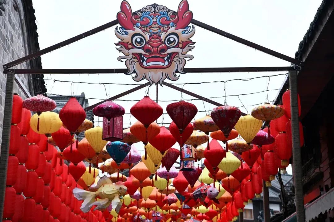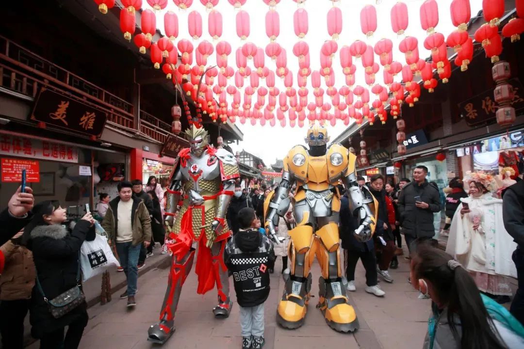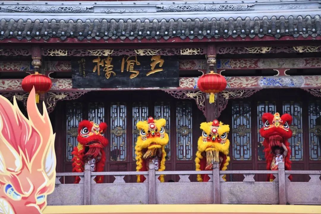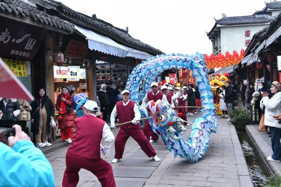 而龙狮巡游闹新春是本次展演活动的另一大亮点,龙狮队伍在古镇老街巡游,寓意着新年的祥瑞与繁荣,与古朴的建筑相映成趣。同时融入鱼儿灯等民俗方阵,真人国风机甲亮相,龙宝人偶、财神人偶、熊猫人偶加入巡游队伍,为整个活动增新添彩。威武雄壮、热烈喜庆的流动式龙狮贺年让大街小巷更加年味十足。