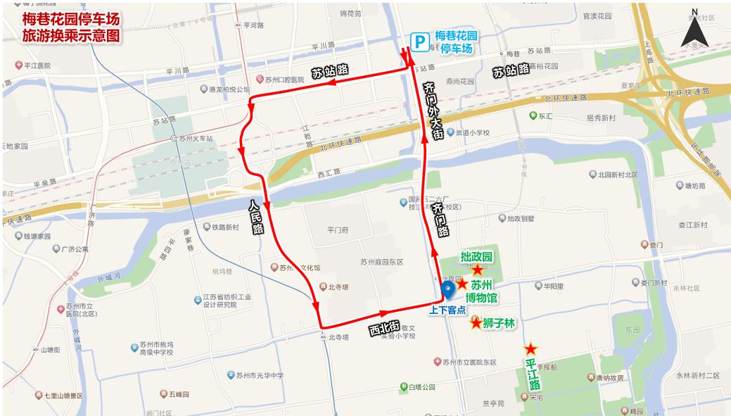 循环线路(运行时间10:00-17:00):梅巷花园停车场—齐门外大街—苏站路—人民路—西北街—齐门路(拙政园景区)—齐门外大街—梅巷花园停车场。
