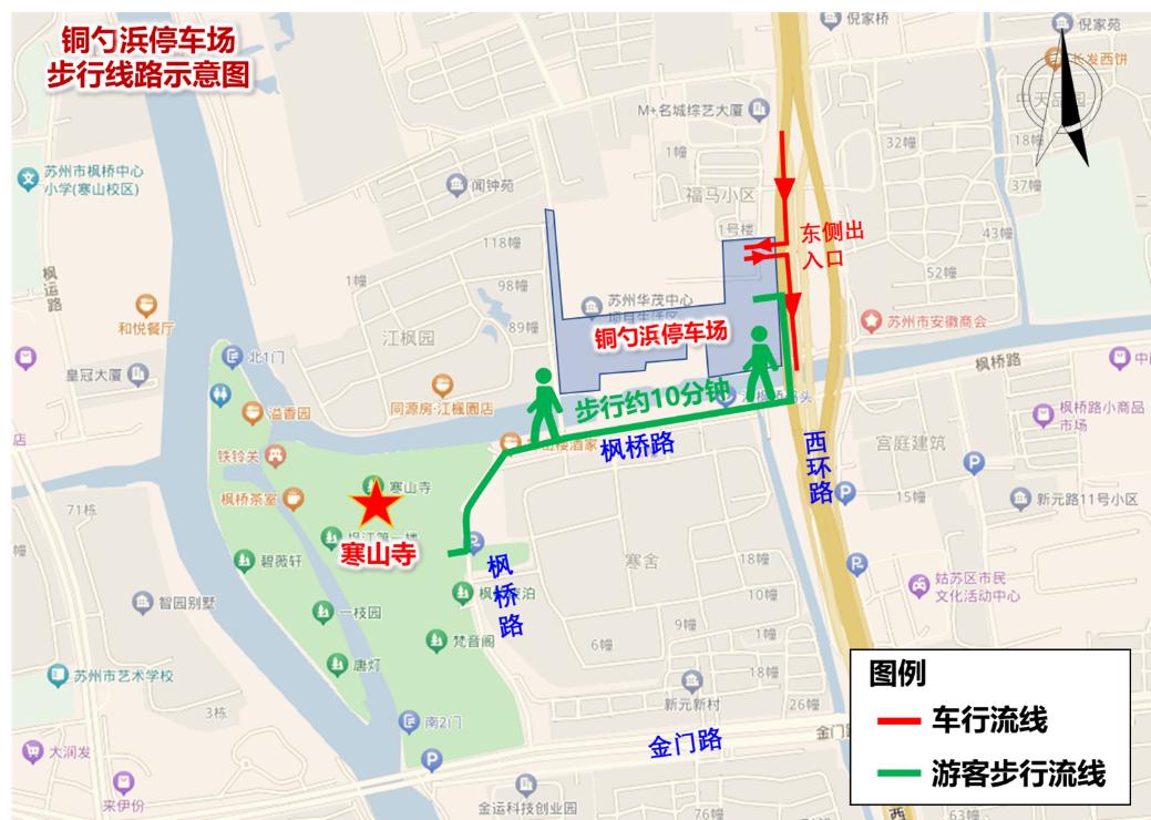 铜勺浜停车场(约500泊位)服务于寒山寺,游客步行进入寒山寺景区(步行时间约10分钟)。